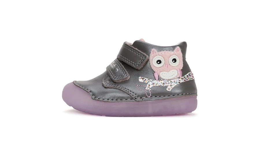 D.D. Step, bagoly mintás, sötétben fluoreszkáló átmeneti cipő kislányoknak. Orra gumival védett, ezáltal megvédi a cipőt a kopástól. Minőségi, valódi bőrből készült, két tépőzáras így könnyen lábfejre igazítható. Talpa könnyű és rugalmas, szára közepesen magas így ideális választás az őszi időszakra. Kiszállítás 1-2 munkanap. A méret kiválasztása után látható a cipő belső talphossza!