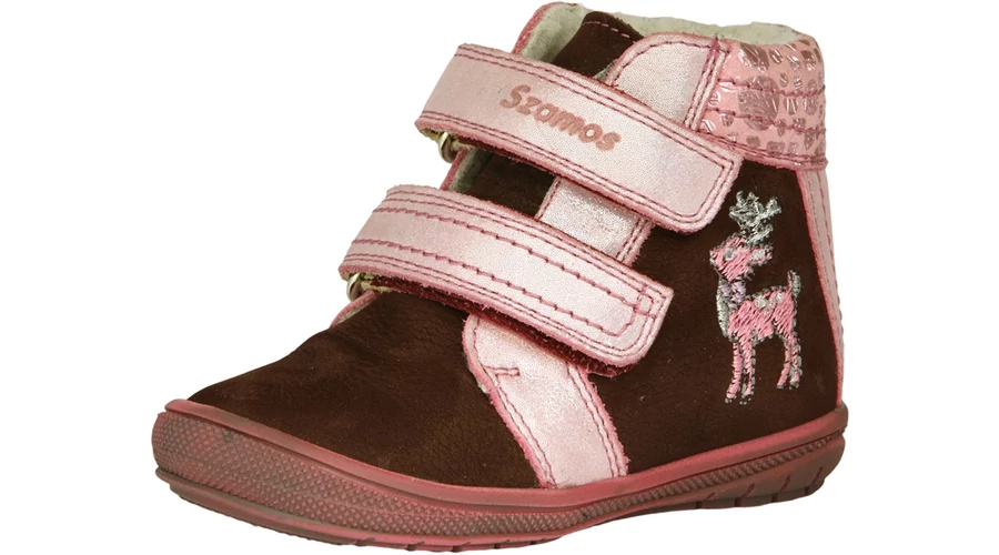 Rénszarvassal díszített, hajlékony talpú, magas szárú, bordó-rózsaszín, két tépőzáras, könnyű, szőrme béléses szamos cipő lányoknak. Kiváló első cipőnek. A méret kiválasztása után látható a cipő belső talphossza. Magyar termék, a kiszállítása 1-2 munkanap.