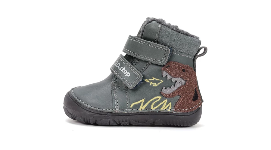 A kis felfedezők egyik kedvence ez a dinoszauruszos D.D.Step barefoot bakancs nemcsak vagány, hanem rendkívül kényelmes is. A valódi bőr felsőrész strapabíró, mégis rugalmas, így ideális a mindennapi mozgáshoz. A puha bundás bélés melegen tartja a lábat, a sötétben világító talp pedig extra élményt ad a sötétebb napokon, minden lépés egy új kaland! A cipő barefoot kialakítása biztosítja a természetes mozgást: széles lábfejrész, rugalmas, hajlékony talp és könnyű szerkezet támogatja a helyes járásmintát. A dupla tépőzáras záródás egyszerre kényelmes és stabil, így a bakancs jól tartja a bokát, miközben önállóan is könnyen felvehető.