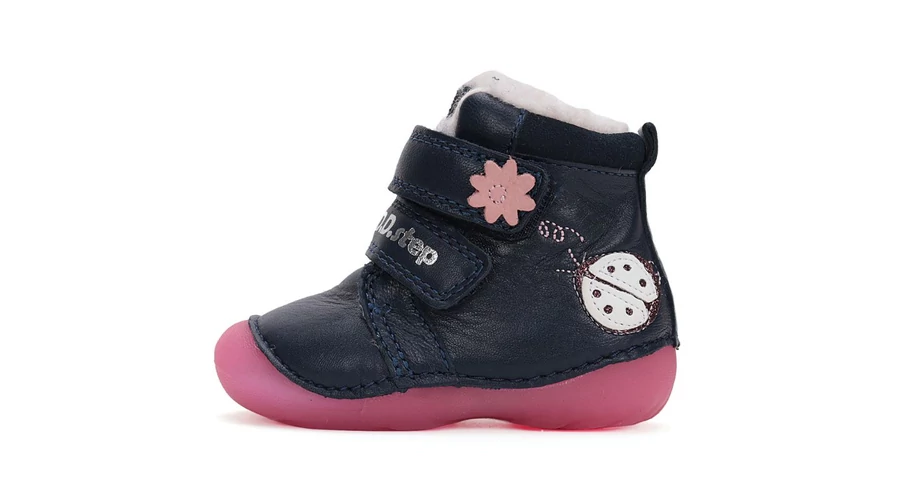 Amennyiben a megfelelő téli lábbelit keresed kislányodnak ez a D.D. Step bélelt cipő ideális választás. Sötétkék színű, cuki katica mintás ami biztosan elnyeri kislányod tetszését. Melegen bélelt, valódi bőrből készült, két tépőzáras így könnyen lábfejre igazítható. Orra gumival védett ezáltal nagyon strapabíró, talpa pedig rugalmas és csúszásmentes. Kérge megfelelő tartást biztosít így az első cipőnek is tökéletes.