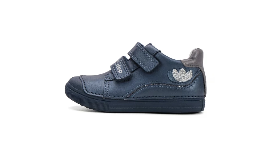 A D.D Step kislány bőr cipő elegáns és praktikus választás mindennapi viseletre. Magas minőségű bőrből készült, amely tartós és kényelmes hordást biztosít a fejlődő lábak számára. A puha belső rész és az ergonomikus kialakítás megfelelő támaszt nyújt, miközben a láb szabad mozgását is lehetővé teszi. A két tépőzár segítségével a cipő könnyen fel- és levehető, így a gyerekek önállóan is használhatják. A sötétkék szín és a diszkrét, csillogó virágdísz egyszerre teszi játékossá és stílusossá ezt a modellt. A belső talphossz a méret kiválasztása után látható.