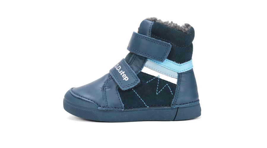 Ez a D.D.Step sötétkék, bélelt, bőr és velúr kombinációjú fiú téli cipő megbízható társ a hideg napokon. A cipő természetes bőr és velúr felsőrésze strapabíró, mégis rugalmas, így biztosítja a kisfiúk számára a kényelmes mozgást és a megfelelő szellőzést. A puha, meleg bundás bélés gondoskodik a komfortos hőérzetről, míg a rugalmas, csúszásmentes talp stabil tartást ad minden lépésnél. A két tépőzáras pánt egyszerű és biztonságos záródást biztosít.