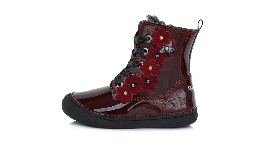 Bordó színű, virágokkal díszített, melegen bélelt téli gyerekcipő lányoknak. Kiváló viselet a téli hideg napokon. A fűzőnek köszönhetően könnyen a lábfejre igazítható. Talpa rugalmas és hajlékony, megkönnyíti a gyerekek járását.