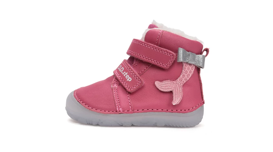 A D.D.Step rózsaszín barefoot téli kislány cipő sellő mintával igazi különlegesség, amely vidámságot és játékosságot hoz a hideg napokba. A barefoot kialakítás rugalmas, puha talpat biztosít, amely a mezítlábas járás élményét nyújtja, így támogatja a láb természetes fejlődését. A prémium minőségű bőr felsőrész tartós és könnyen tisztítható, míg a belső meleg bélés gondoskodik a komfortérzetről. Az oldalán elhelyezett csillogó sellő minta és masni mesés hangulatot ad, amit a gyerekek imádni fognak. A két tépőzáras pánt megkönnyíti a fel- és levételt, a csúszásmentes, hajlékony talp pedig biztonságos járást nyújt. Fluoreszkáló funkciójának köszönhetően minden lépés még varázslatosabbá válik. Ideális választás a mindennapi téli használatra.