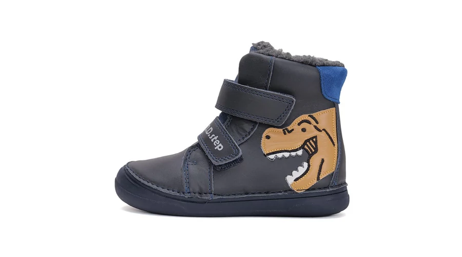 Vagány dínó mintás, sötétkék színű D.D. Step téli cipő ami biztosan elnyeri kisfiad tetszését. Talpa természetes gumiból készült, strapabíró ugyanakkor nem terheli feleslegesen gyermeked lábát, nagyon könnyű és rugalmas viselet, amely természetes mozgást tesz lehetővé. Kívül valódi bőrből, belül meleg bunda béléssel készült, amely a hidegebb téli napokon is melegen tartja a lábakat. A méret kiválasztása után látható a cipő belső talphossza!