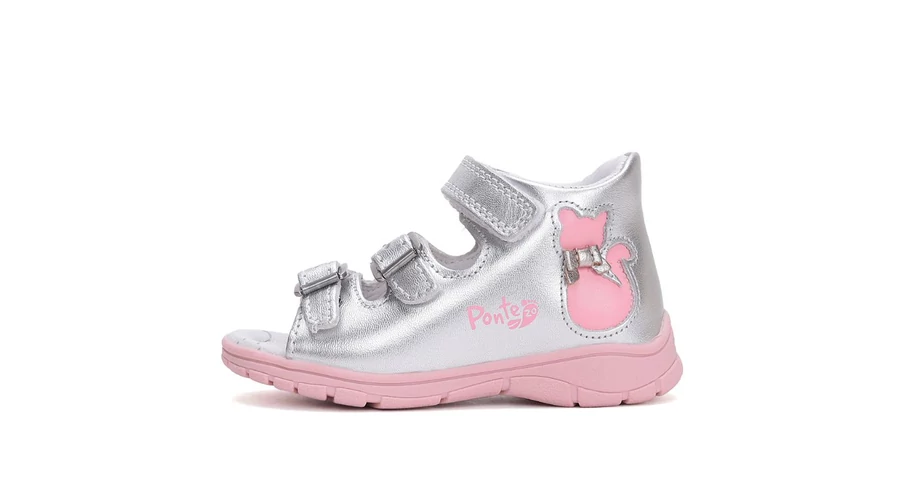 Amennyiben a megfelelő supinált benti váltó lábbelit keresed kislányodnak ez a Ponte20 szandál tökéletes választás lesz számára. Cuki cica mintás, ezüst színű ami biztosan elnyeri kislányod tetszését. Valódi bőrből készült amely puha, tartós és jól szellőzik, hogy gyermeked lábai egész nap kényelmesen érezzék magukat. Talpa supinált, a belső harántemelés a láb természetes ívének megtartásához és az egészséges járás elősegítéséhez járul hozzá. Talpa csúszásmentes gumi, így biztonságos és stabil lépteket biztosít minden felületen. Két csat, egy tépőzáras kialakítású így gyorsan és egyszerűen fel- és levehető, miközben tökéletesen lábfejre illeszkedik.