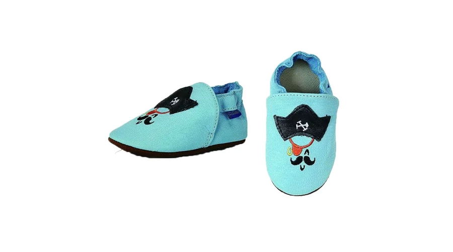 D.D.Step, világos kék, kalóz mintával díszített, sarok részén gumival rögzített, varrott, fiú bőrtalpú kocsicipő. A D.D.Step kocsicipő kívül-belül valódi bőrből készül. A talpa, csúszásgátlós gumi bevonattal ellátott. Ideális viselet babakocsiba vagy szobacipőnek. Ezt a D.D.Step bőrtalpú kocsicipőt kisfiúknak ajánljuk. Belső talphossz: S (16-17) : 10 cm M (18-19) : 11 cm L (20-21) : 12 cm