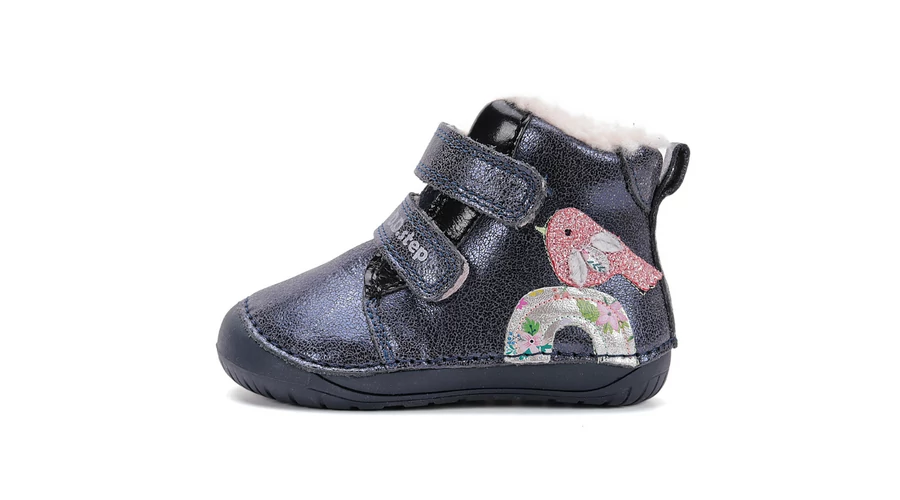 Ez a D.D.Step barefoot kislány cipő a mezítlábas járás élményét nyújtja, miközben megbízható védelmet biztosít a hideg téli napokon. A puha, hajlékony talp lehetővé teszi a láb természetes mozgását, így segíti az egészséges fejlődést. A sötétkék csillogó felsőrész különleges megjelenést ad, míg az oldalán található vidám madár és szivárvány minta garantáltan elnyeri a gyerekek tetszését. A két tépőzáras pántnak köszönhetően a cipő könnyen fel- és levehető, a belső meleg bélés pedig gondoskodik a maximális kényelemről. Rugalmas, csúszásmentes talpa biztonságos járást nyújt, így ez a modell tökéletes választás a mindennapi téli használatra.