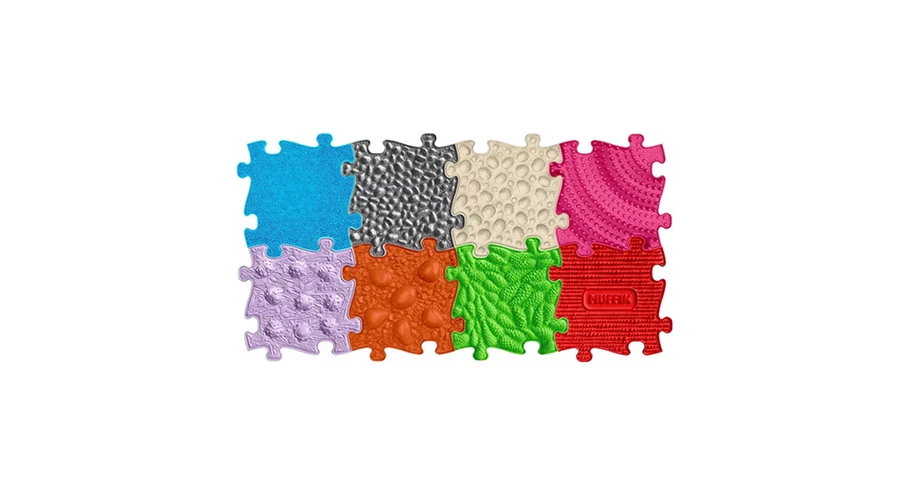 A Muffik szenzomotoros ortopédiai szőnyeg egy innovatív és szórakoztató módszer a gyermekek láberősítésére, bokasüllyedés kezelésére, lúdtalp korrigálására, vagy bármilyen ortopédiai problémák kezelésére. A szőnyeg különböző formájú, felületei, mint például kavicsok, kagylók és kövek, segítenek a gyermekeknek fejleszteni az egyensúlyérzéküket és erősíteni lábuk izmait. A puzzle darabokból álló szőnyeg könnyen bővíthető, így fokozatosan növelhető a nehézségi szint, az elemek könnyen illeszkednek egymáshoz, így gyermekeitek számára a legideálisabb pályát tudjátok összerakni. A készlet 8 darabból ál: