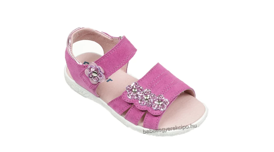 Rózsaszín színű, lábfej részén csillogós kövekkel kirakott virágokkal díszített, gyerek szandál lányoknak. Lábfej és boka körüli része tépőzárral állítható. Oldalt és kéreg részén nyitott fazonú. Puha hajlékony talpa megkönnyíti a gyerekek járását. Valódi bőrből készült. Kiszállítás 1-2 munkanap.