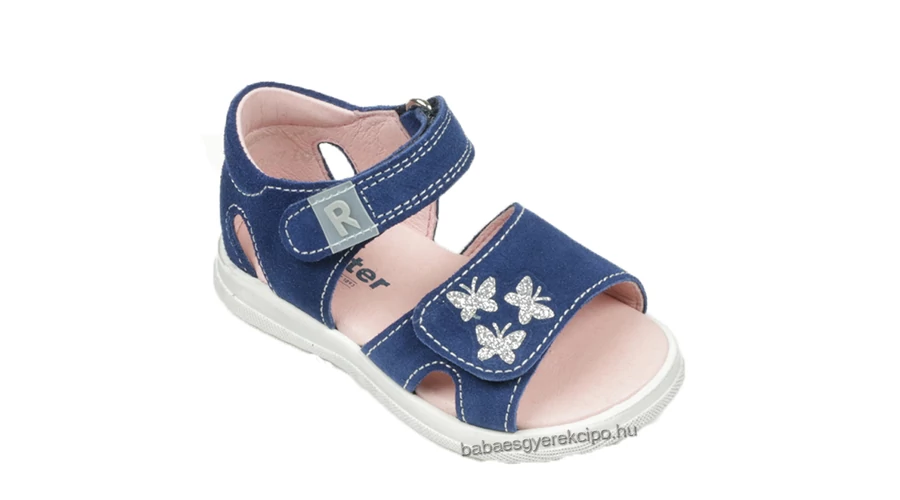 Sötétkék színű, pillangókkal díszített gyerek szandál lányoknak. Lábfej és boka körüli része tépőzárral állítható. Oldalt nyitott fazonú. Puha hajlékony talpa megkönnyíti a gyerekek járását. Valódi bőrből készült. Kiszállítás 1-2 munkanap.