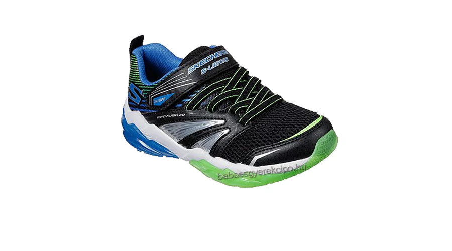 Skechers, vagány, fekete alapon kék-zöld, villogó talpú, sport cipő fiúknak.
