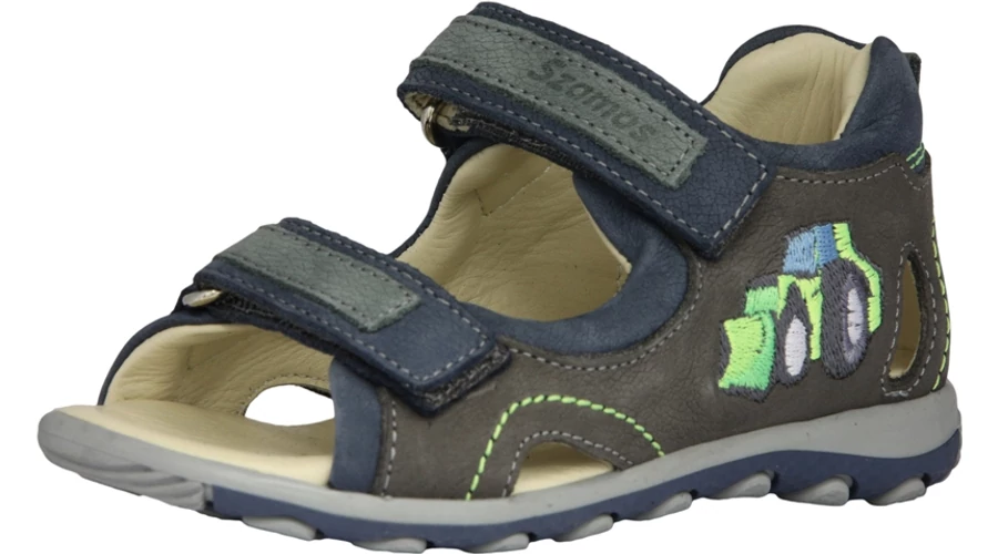 Szamos, barna-kék, hímzett traktor mintával díszített gyerekszandál fiúknak.