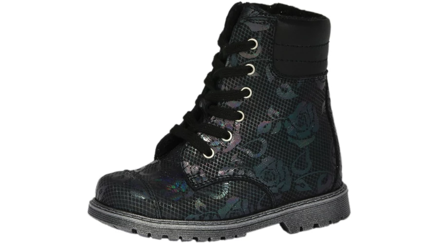 Fekete színű, rózsa mintával dísztett, fűzős - cipzáros, bélelt bakancs lányoknak. Valódi bőrből készült. Kiváló viselet a hideg téli napokra. Magyar termék!