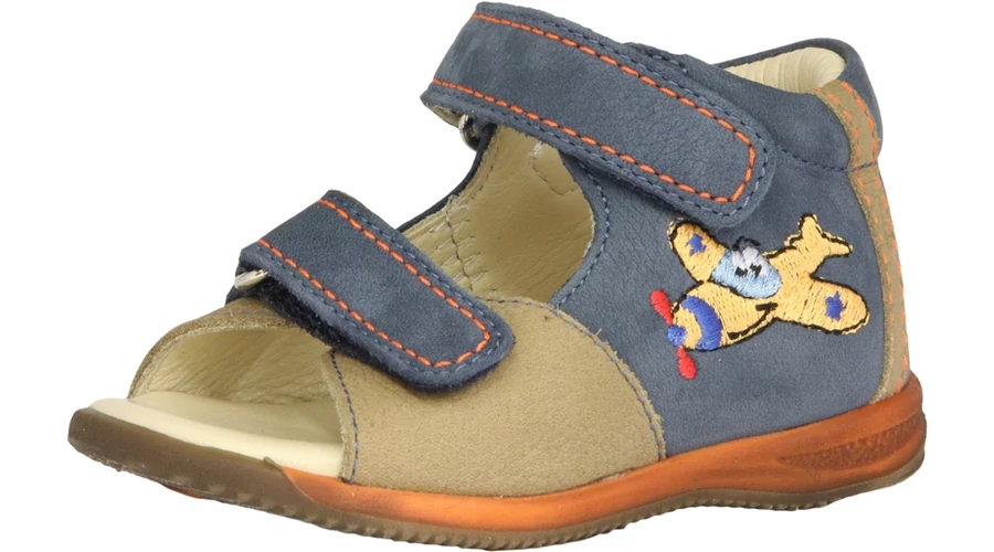 Kék-barna színű, oldalán hímzett repülővel díszített gyerekszandál fiúknak. A két tépőzárnak köszönhetően könnyen a lábfejre igazítható. Valódi bőrből készült. Puha hajlékony talpa megkönnyíti a gyerekek járását. Magyar termék.