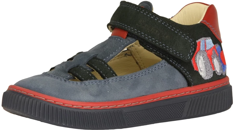 Kék-fekete színű, oldalán hímzett traktorral díszített tavaszi gyerekcipő fiúknak. A tépőzárnak köszönhetően könnyen a lábfejre igazítható. Valódi bőrből készült. Puha hajlékony talpa megkönnyíti a gyerekek járását. Magyar termék.