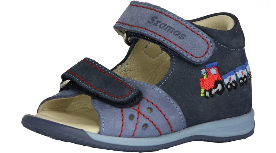 Szamos, kék , hímzett vonat mintával díszített gyerekszandál fiúknak.