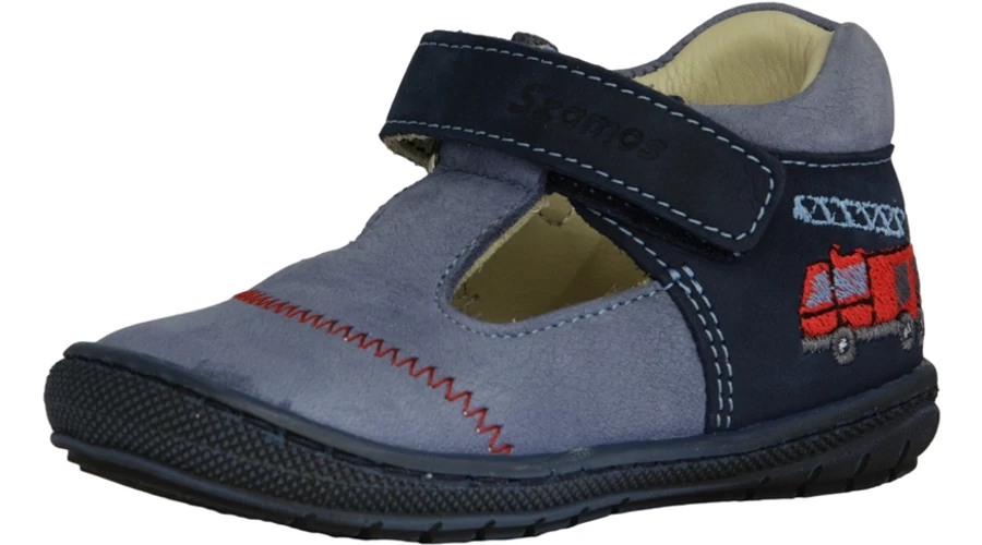 Szamos, kék színű, hímzett tűzoltóval díszített tavaszi gyerekcipő fiúknak.