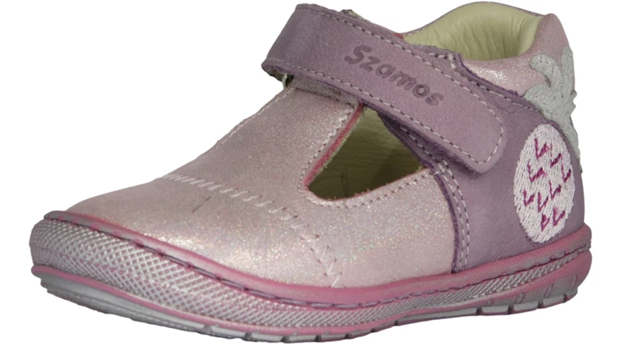 Lila színű, oldalán hímzett ananász mintával díszített tavaszi gyerekcipő lányoknak. A tépőzárnak köszönhetően könnyen a lábfejre igazítható. Valódi bőrből készült. Puha hajlékony talpa megkönnyíti a gyerekek járását. Magyar termék.