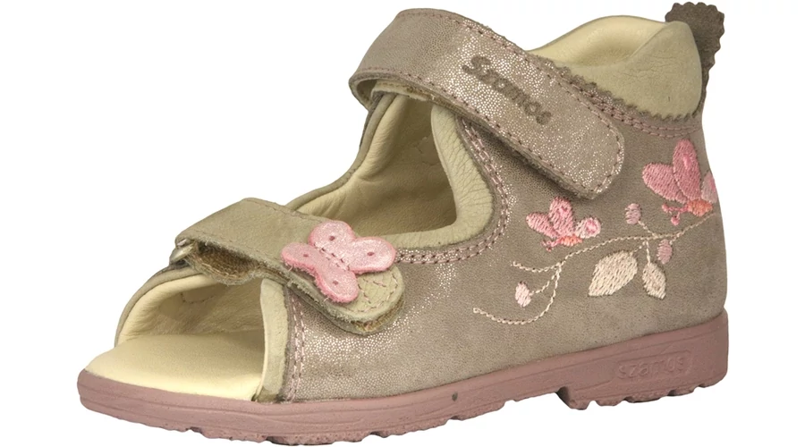 Ez a csillogó bézs árnyalatú Szamos supinált szandál bájos pillangó- és virághímzéssel díszített, igazi kislányos stílusban. Valódi bőr felsőrésze puha és légáteresztő, míg a supinált talpszerkezet támogatja a gyermek helyes lábtartását. A tépőzáras pánt egyszerű és gyors fel- és levételt biztosít, a lábfejen elhelyezett pillangó pedig játékos részletként teszi különlegessé.A belső talphossz a méret kiválasztása után látható!