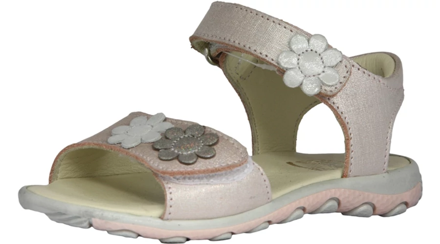 Púder színű, virágokkal díszített nyitott fazonú gyerekszandál lányoknak. A két tépőzárnak köszönhetően könnyen a lábfejre igazítható. Valódi bőrből készült. Puha hajlékony talpa megkönnyíti a gyerekek járását. Magyar termék.