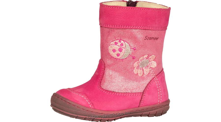 Rózsaszín színű, oldalán hímzett katicával és virággal díszített, cipzáros, bélelt, csizma lányoknak. Kívül-belül valódi bőrből készült. Puha hajlékony talpa megkönnyíti a gyerekek járását. Magyar termék! Kiszállítás 1-2 munkanap.