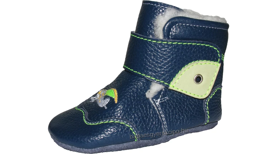 Szamos, sötétkék színű, tépőzáras, kocsicipő kisfiúknak. Valódi bőrből készült, melegen bélelt,  puha talpú, repülő mintával díszített babacipő.  Kiszállítás 1-2 munkanap.