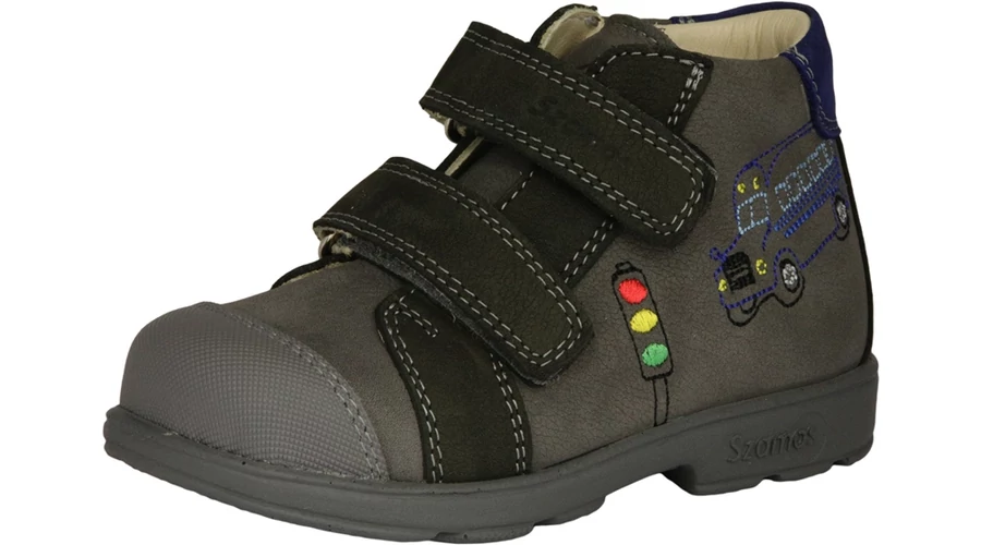 Ez a Szamos supinált fiú cipő modern szürke-fekete színkombinációban, vidám busz és közlekedési lámpa mintával készült, amely garantáltan elnyeri a kisfiúk tetszését. A valódi bőr felsőrész tartósságot és kényelmet biztosít, míg a supinált kialakítás elősegíti a lábboltozat és a boka megfelelő fejlődését. A dupla tépőzár egyszerű és gyors felvételt tesz lehetővé, így a cipő praktikus választás mindennapi használatra, óvodai vagy szabadtéri tevékenységekhez. A belső talphossz a méret kiválasztása után látható!