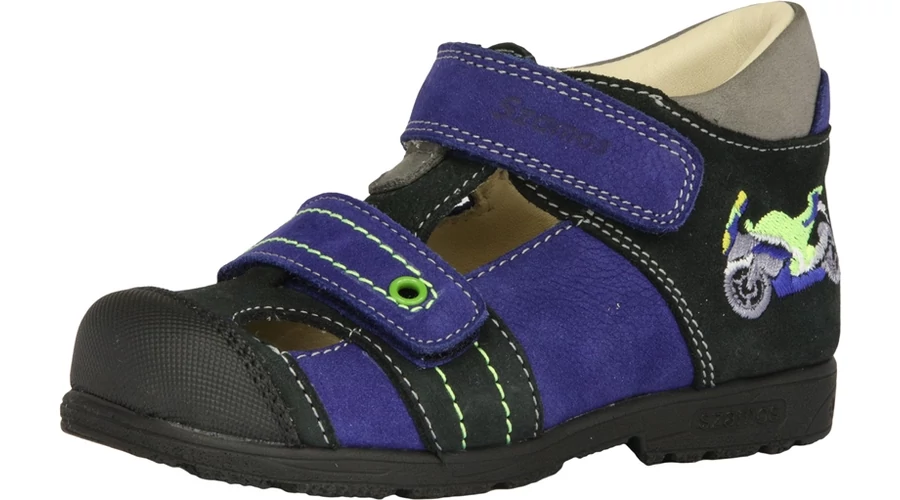 Kék-fekete színű, hímzett motorral díszített tavaszi gyerekcipő fiúknak. Orrvédővel ellátott, két tépőzárral állítható. Supinált /döntött/ talpú lábbeli kérge kemény, sarok ékkel van ellátva. A megerősített kéreg megtámasztja a saroktő csontjait. A sarka belülről kifelé döntött, a sarok belső része 4,5 mm-rel magasabb a külsőnél, így korrigálja a boka bedőlését. Magyar termék. Egészségpénztáraknál elszámolható.