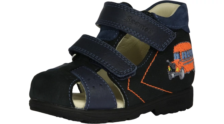 Szamos, supinált talpú, kék, hímzett busz mintával díszített gyerek szandál fiúknak.