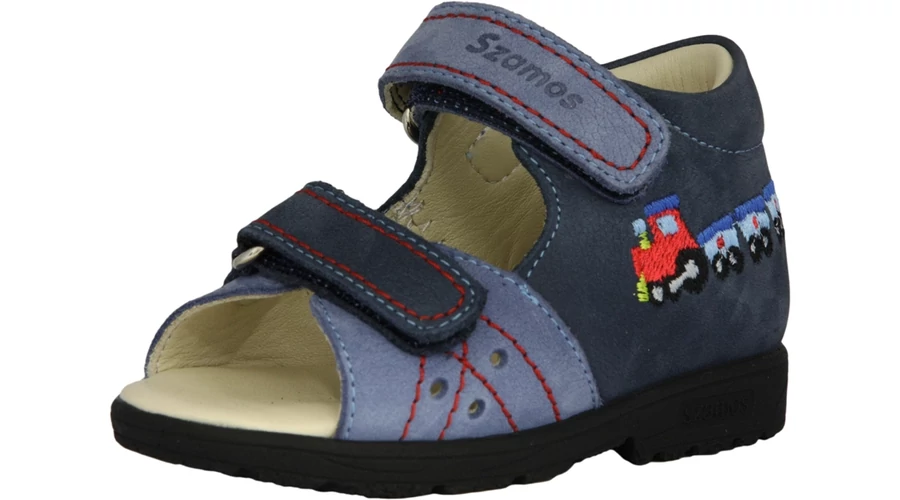 Szamos, supinált talpú, kék, hímzett vonat mintával díszített gyerek szandál fiúknak.