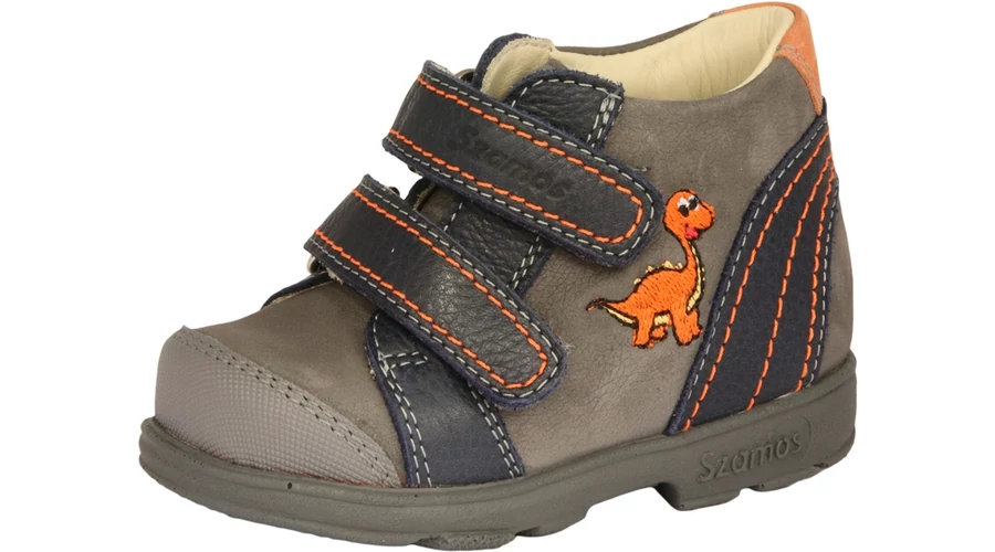 Kék-szürke, oldalán hímzett dínó mintával díszített átmeneti gyerekcipő fiúknak. Orrvédővel ellátott, két tépőzárral állítható. Supinált /döntött/ talpú lábbeli kérge kemény, sarok ékkel van ellátva. A megerősített kéreg megtámasztja a saroktő csontjait. A sarka belülről kifelé döntött, a sarok belső része 4,5 mm-rel magasabb a külsőnél, így korrigálja a boka bedőlését. Magyar termék. Egészségpénztáraknál elszámolható.
