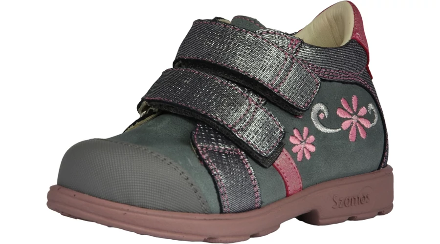 Kék színű , virág mintával díszített átmeneti gyerekcipő lányoknak. Orrvédővel ellátott, két tépőzárral állítható. Supinált /döntött/ talpú lábbeli kérge kemény, sarok ékkel van ellátva. A megerősített kéreg megtámasztja a saroktő csontjait. A sarka belülről kifelé döntött, a sarok belső része 4,5 mm-rel magasabb a külsőnél, így korrigálja a boka bedőlését. Magyar termék. Egészségpénztáraknál elszámolható.