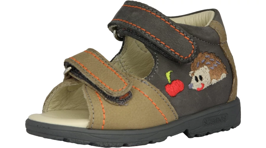 Szamos, supinált talpú, szürke-barna, hímzett süni mintával díszített gyerek szandál fiúknak.