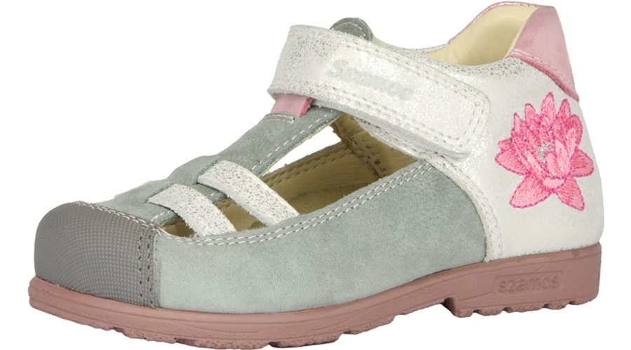 Szamos, supinált talpú, szürke-ezüst színű, hímzett virággal díszített tavaszi cipő lányoknak.