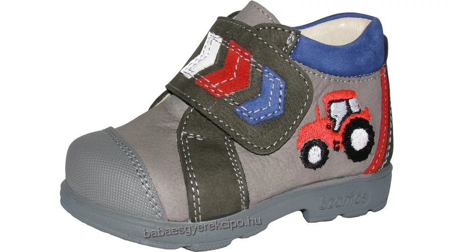 Szürke színű, oldalán hímzett kamionnal díszített átmeneti cipő fiúknak. Orrvédővel ellátott, tépőzárral állítható. Supinált /döntött/ talpú lábbeli kérge kemény, sarok ékkel van ellátva. A megerősített kéreg megtámasztja a saroktő csontjait. A sarka belülről kifelé döntött, a sarok belső része 4,5 mm-rel magasabb a külsőnél, így korrigálja a boka bedőlését. Magyar termék. Egészségpénztáraknál elszámolható. Kiszállítás 1-2 munkanap.