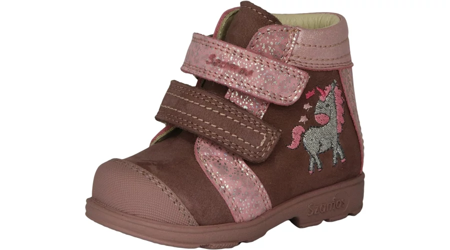 Ez a Szamos supinált kislány cipő igazi mesebeli darab, amely a fejlődő lábak támogatása mellett a kislányok fantáziáját is megmozgatja. A puha, valódi bőr felsőrész meleg barna és csillogó rózsaszín kombinációban készül, oldalán aranyos unikornis hímzéssel. A supinált kialakítás segít a helyes lábtartás kialakításában és a boka stabilizálásában. A két tépőzáras pánt egyszerűvé teszi a fel- és levételt, így ideális mindennapos viseletre óvodába, bölcsődébe vagy sétákhoz. A belső talphossz a méret kiválasztása után látható!