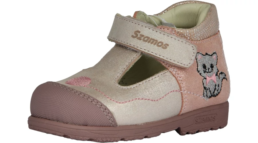 Bézs színű, cicával díszített tavaszi gyerekcipő lányoknak. Orrvédővel ellátott, tépőzárral állítható. Supinált /döntött/ talpú lábbeli kérge kemény, sarok ékkel van ellátva. A megerősített kéreg megtámasztja a saroktő csontjait. A sarka belülről kifelé döntött, a sarok belső része 4,5 mm-rel magasabb a külsőnél, így korrigálja a boka bedőlését. Magyar termék. Egészségpénztáraknál elszámolható.